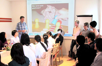 現地3日間の行程で、リハビリ施設、総合医療センター、高齢者施設の見学をしました。施設では、ドイツの社会福祉についての説明を伺ったり、実際に理学療法の施術やリハビリテーションの視察・見学を行い、リハビリテーションの幅の広さを感じることができました。「絵を完成させる」という作業1つでも、日本では、塗り絵から書き始め、慣れてきたころに自由に描いてもらう方法を行いますが、ドイツでは初めから自由に描いてもらいます。研修に参加した伊奈杏都さん(作業療法学科3年)は「リハビリテーションの概念は日本とほとんど変わらないが、国が変わると同じ療法でも違うことをしているように思え、とても不思議な気持ちになった。文化や考え方、国民性の違いでそれぞれ適した施術方法があることを学び、リハビリテーションの奥深さや面白さを実感した」と充実した研修を振り返り語ってくれました。