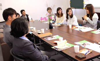 3、4年生7名が、幼稚園教諭になるための心構えや魅力などを伺い、就職先を検討する際は教育方針や園の雰囲気など、印象や思い込み、人からの意見で判断するのではなく、直接見て、聞くことが大切とのお話をいただきました。今年度から新制度になり導入された「認定こども園」についても説明がありました。
