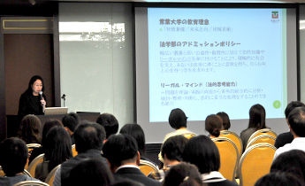 法学部教員から学部紹介や学びの特徴の説明、公務員試験対策講座の紹介などがあり、続いて在学生によるゼミや地域での活動、静岡県庁や静岡市役所など行政機関を中心としたインターンシップの報告がなされ、参加者は教員や学生の話に熱心に耳を傾けている様子でした。