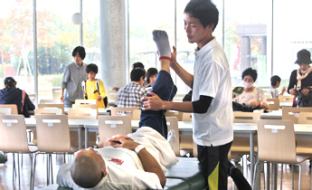 各店舗では飲み物や試食の提供もあり、地域の協力も得ることができました。学内では、作業療法学科の学生による身体測定やアスレティックトレーナーサークル(CATS)の学生によるトレーナーステーションを開設。ゴールした参加者は測定をしたり、ストレッチなどを施してもらったりウォーキングの疲れを癒やしていました。