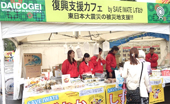 「SAVE IWATE しずおか」は東日本大震災に関し、(1) 被災地の支援活動事業、(2) 災害関連情報収集及び発信事業、(3) 関係団体とのネットワーク構築事業、(4) 復興まちづくりに関する調査・研究・事業、(5) 活動資金開発にかかる事業を行っている団体です。被災地ではまだ仮設住宅で暮らす方も少なくなく、被災の記憶が風化されないようにと、大道芸ワールドカップイン静岡の会場にて、被災地の物産販売を行いました。