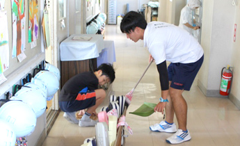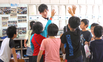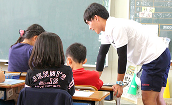 学校では、昼休みの遊びや授業補助を行っています。週1回のペースで訪問しており、訪問時により対応する内容はさまざまで、算数、書写、国語、体育、昼休みの遊び相手、放課後の陸上部の練習補助などを行っています。授業では、教室内を巡回しながら児童にアドバイスをしたり、昼休みは安全面に配慮しながら外遊びのサポート、昼休み後の清掃など、児童たちと一緒に活動します。大学生の頼れるお兄さんの存在に、「先生!」の声とともに子供たちが駆け寄ってきます。