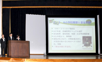 この事業は、平成27年度地域交流・連携推進事業「地域連携による下校見守りボランティア『まもろーる』における安心・安全教育の展開」(代表:木村佐枝子、中村俊洋、松岡孝江)に採択されたもので、都田小学校児童の下校見守りボランティア「まもろーる」の継続実施、児童とのまち歩き、地図づくりの成果として「都田安心・安全マップ」の作成等の活動の成果を報告しました。