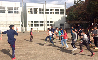 低学年を中心に約30名の参加があった「速く走りたい人のための陸上教室」では、上に高く飛びながらスキップをしたり、ダッシュで競争したりさまざまなトレーニングを楽しみながら行いました。正しい姿勢と手足を大きく動かすことが身につくよう工夫されたトレーニングを通して、子どもたちは自然と早く走ることができるようになっていました。