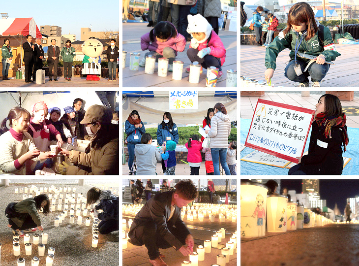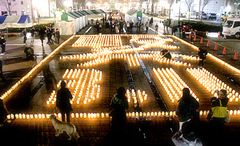 約6,000本のキャンドルは、震災の記憶を次世代へとつなぐという思いを込め「繋」という文字を作り、暗闇のなかで輝いていました。