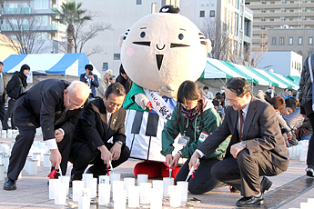 14時46分、スタッフは被災地の方角に向かい、黙祷し、その後、17時には鈴木康友浜松市長、常葉大学 鈴木治副学長、社会貢献ボランティアセンター 田中センター長、実行委員長の原間里穂さん(こども健康学科3年)が揃い、点灯式が行われました。