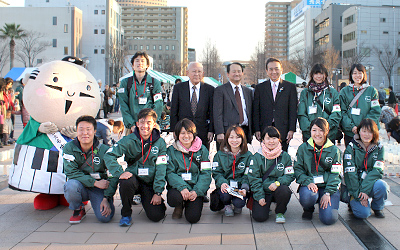 点灯式で浜松市長は「我々も防災、減災に努めなければいけない。そんななかこのイベントは多くの市民の皆さまに改めて知っていただく貴重な機会である」と挨拶されました。また、アクト通りに並ぶテントでは、東北物産展、展示、子ども向けの防災クイズなどが行われ、なかでも本学健康栄養学科の学生でつくるサークル「食ポート」は豚汁を販売、来場者の心も温めていました。