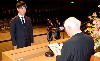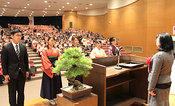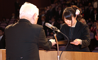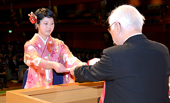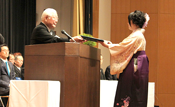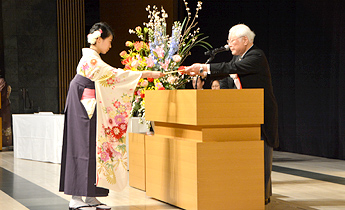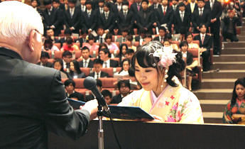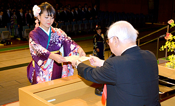 各学部の代表者に西頭德三学長が学位記を授与した後、「大学への教育効果は、皆さんの多様な活動を通じて地域社会に浸透していくと確信している。素晴らしい人生を築いてほしい」とはなむけの言葉を送りました。