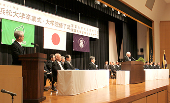 2013年に3大学を統合した常葉大学が開学したため、浜松大学としては最後の卒業式となりました。各学部、研究科の代表者に、西頭德三学長が卒業・修了証書を手渡し、東日本大震災後から同大の学生が取り組んでいる被災地支援に触れ「5年間切れ目のない活動を続けていることに敬意を表したい」と話しました。