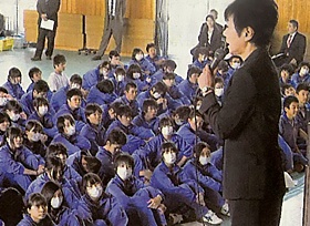 生徒約630人と保護者約350人を対象に「思いやる心の表現」と題して良好な人間関係を築くためのマナーを講演し、「相手を思いやる心を持つことによって、相手との関係が良くなる」と紹介しました。