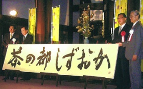 式典は川勝平太静岡県知事や徳川恒孝実行委員会会長の挨拶に引き続き、出席者約300人が見守るなか、荘厳な本堂の中央で、本学教育学部生涯学習学科の平形精一教授が、「茶の都しずおか」と力強く揮毫し、参加者から盛大な拍手を浴び、開幕に花を添えました。