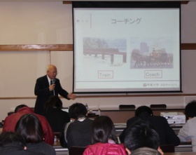 田中副学長は、ご自身のスポーツ指導者また高校教員時代の経験や事例を交え「コーチの役割」やトレーニング方法についてアドバイスされました。講演の中で副学長は「人を作るということは全人的な立場で考える必要がある。心や言動をどう育てていくか、教育心理学を背景としたコーチングを理解することが大切だ」と話しました。また、最後に、「自分の力のなさを生徒にぶつけて暴言をはくことは決してしてはいけない」と教育者の立場で現役の教員に熱く語りました。参加された教員はメモをとりながら熱心に話を聞かれていました。