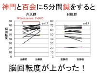 講演のテーマは「市民のための北区☆健康フェア」で好評だった「アタマのツボ~Yes/脳(No)!東洋医学!」。参加者に赤と青2枚の紙を配布し、Yse・Noを色で答えさせるクイズ形式を盛り込みながら、物忘れに効くツボや、脳が元気になるツボ、耳に効くツボなど身近にある悩みに対処できるツボについて、研究の結果を加えつつ、おもしろおかしく解説しました。