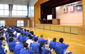 全生徒750名と教職員、保護者を対象に「思いやる心の表現」をテーマに話し、講演を聞いた教員からは「一番大切なことを教えてくださった」、「生徒たちの様子を見て、子供たちの心に響いたのがわかった」などの感想が寄せられました。