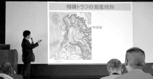 阿部准教授は「相模灘で発生する津波について」という演題で講演し、阿部准教授は東日本大震災での体験を振り返りながら、