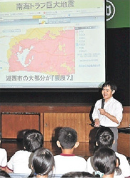 阿部准教授は湖西市や浜名湖西岸の地図をスクリーンに表示し、南海トラフ巨大地震の発生時、浜名湖沿岸の一部は1~2メートル浸水する恐れがあると説明。「1メートルの浸水でもいろんな物が流れてくる」と話し、避難の大切さを訴えました。地震の「発生前」「発生数分後」「発生十数分~1時間後」などに分け、児童が行うべきことも説明し、「発生前の今のうちに、学校周辺の危険箇所や避難場所などを調べておこう」と呼び掛けました。