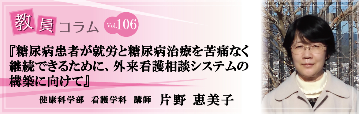 この現状を踏まえて、就労している壮年期2型糖尿病患者が糖尿病やその治療による心理・社会的負担感を相談できる外来看護相談システムの構築を目指して、初段階として「就労している壮年期2型糖尿病患者の心理・社会的負担感への看護援助内容」を明らかにするために研究をしています。就労している糖尿病患者のみならず慢性疾患患者のQOL(生活の質)維持のための看護に役立てたいと考えています。