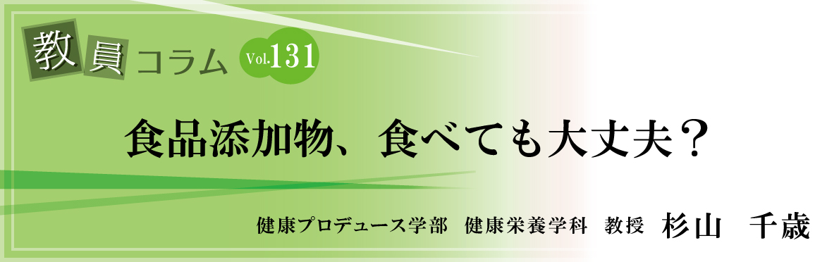 私は、健康プロデュース学部の健康栄養学科で食の安全に関する分野の科目を担当しています。健康プロデュース学部の学生が履修する授業で「あなたは、普段の食生活で食品添加物についてどれくらい意識していますか?」と質問すると、「全く意識していない」という回答から、「かなり意識している」という回答までさまざまです。中には、食べても大丈夫?と思っている学生がいるかもしれないので、以下のような話をします。