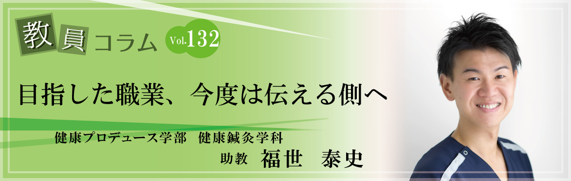 現在は色々なご縁もあり教員として授業を行い、鍼灸師の魅力を学生や高校生に伝えながらキャンパス内の鍼灸接骨院で治療も行っています。また研究も「鍼の刺鍼深度に対する感覚の教育方法」を調べており、学生が卒業後も安全な鍼灸治療が出来るよう成長させるためにはどのような授業を取り入れるべきかを調べています。自分がなりたかった職業の良さを今度は伝える側に立ち、「鍼灸師になりたい」と思ってくれる人をもっと増やしていければ良いなと考えています。