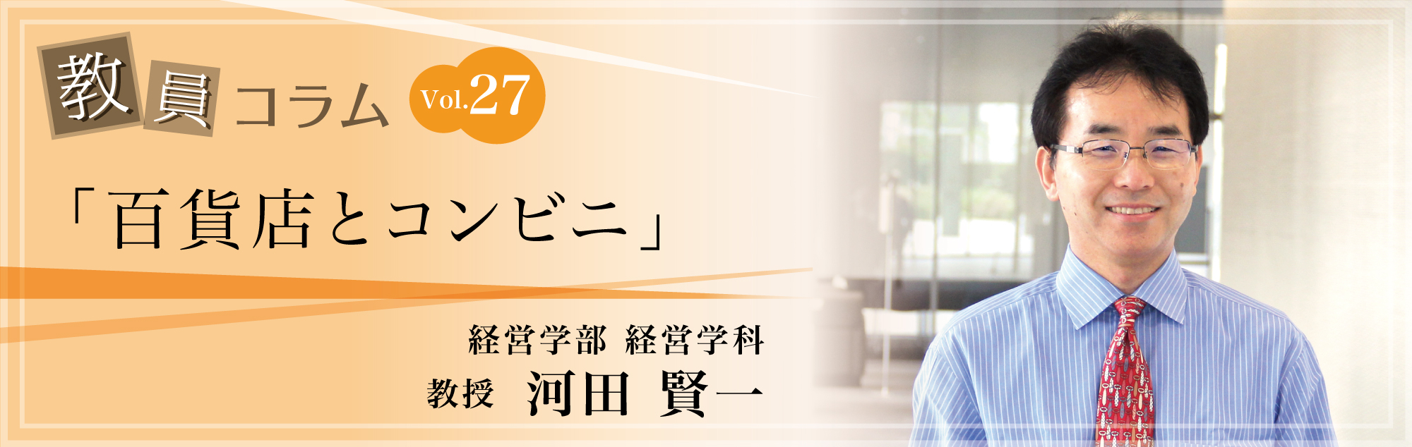 私の研究分野は「流通」です。小売業を研究していると言い換えた方がわかりやすいと思います。小売業の中でも、特に百貨店とコンビニエンスストアを研究対象としています。なぜ、この2つなのかというと、私は岐阜県出身で10歳くらいまで月に一度は、名古屋市の松坂屋、岐阜市の高島屋、四日市市の近鉄百貨店のどれかに連れて行ってもらっていました。私は洋服を買ってもらうわけでなく(母や姉は洋服を買うのがメインで)、大きくて綺麗な百貨店に連れて行ってもらい、屋上のすぐ下の階のレストランで「お子様ランチ」を食べるのが楽しみでした。私より少し年齢層が上の60歳以上の方であれば、百貨店が特別な存在であったと理解していただけると思います。今はイオン(イオンモール)が展開する巨大なショッピングセンターが全国にありますが、私の小さい頃のダイエーやイオン(当時のジャスコ)はデパートと同じような多層階の売場で、低層階で横に広くはありませんでした。同じ多層階の小売業で比較するなら、百貨店は綺麗で誰にとっても憧れの小売業でした。その百貨店がバブル経済崩壊以降、売上高が大きく減少するようになり、それを何とかできないかと思ったのが、百貨店の研究を始めたきっかけです。