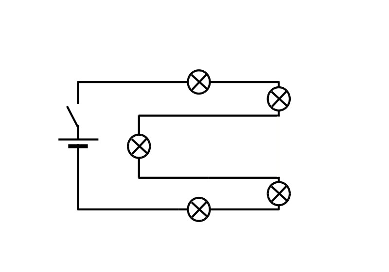 さて、私の一番の興味は電気に関することです。「電気のエネルギーは電線の中を伝わる」と考える人が多いのではないでしょうか。ところが、この考えは間違っており、「電気のエネルギーは電線の周りの空間を伝わる」が正しい考えです。では、図のような回路のスイッチを入れたら、どこから、どのように電流が流れ始め、どの電球が最初に点灯するのでしょうか。