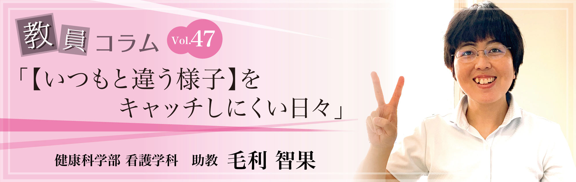 私は大学卒業後、精神科病院で働いていました。精神に障がいを持つ患者さんと関わる上で、目に見えない患者さんのこころの状態が悪くならないために、悪くなったとしても早めに対応できるように、私は患者さんに「いつもと違う様子はないか」という視点を大事にしてきました。またこの視点はこころの健康を保つための支援においても必要なことであるため、大学の教員になってからは、大学生や周囲の人たちに「いつもと違う様子がないか」という視点を持ちながら関わっています。