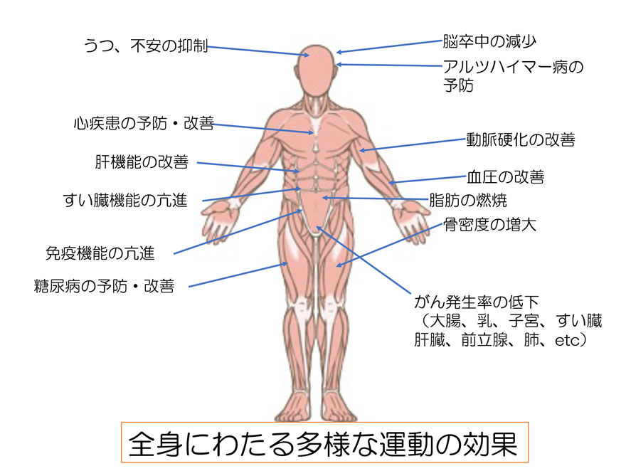 骨格筋はこれまで身体を動かすための運動機能として理解されていましたが、近年Myokineというホルモンが骨格筋から分泌されていることがわかりました。このMyokineは健康の維持や増進にとても重要な役割を果たしています。また、骨格筋の機能と量を維持することは、健康の維持増進、疾病予防、あるいは生命力維持に重要であることが多くの研究から示唆されています。