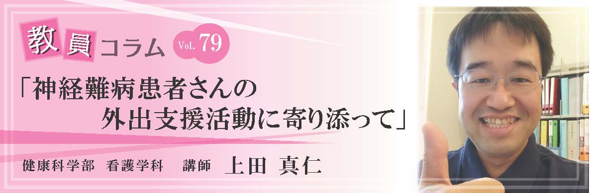 このような取組みを通じ、自分自身も神経難病の皆さんと生活の話題や悩みを共有することで、本当に看護師として求められている支援や内容は何であるかと再考し、そのことを次世代の看護師たちに向けて伝えるための機会ともなっております。何よりもこれまでの当事者の皆様との活動を通じてエネルギーをいただいているのも事実です。私の教員活動と表裏一体だった神経難病の方の外出支援活動を今後も継続していきます。神経難病を問わず、当事者の皆さんやご家族の方で外出支援活動に興味を持たれた方は、健康科学部あるいは上田の研究室までご連絡ください。もちろん、活動の仲間に参加されたい方は大歓迎いたします。