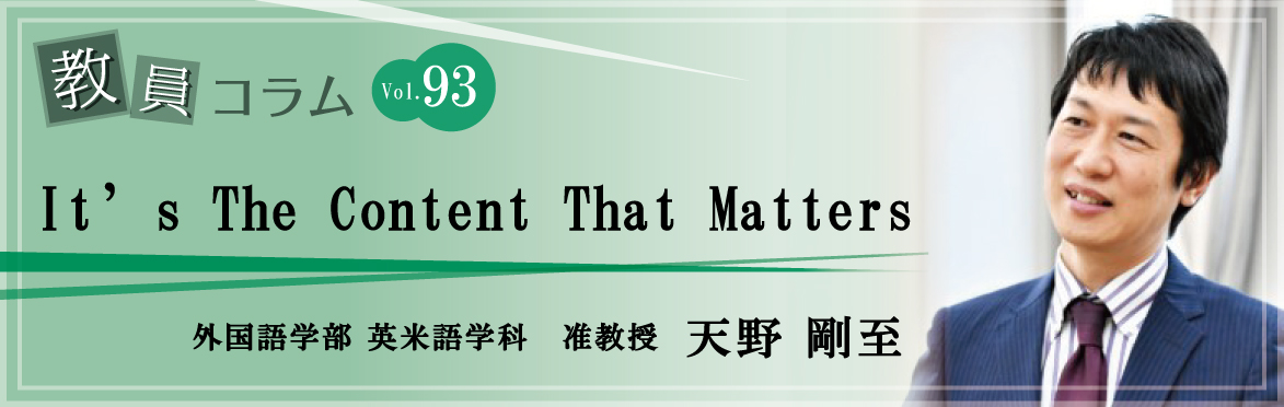 この時私は初めて、“It's the content that matters.”(「大事なのは中身」)という表現を理解したのです。すなわち、英語を「いかに流暢に、正確に」話すかよりも、「何を」話すかのほうがはるかに重要であるということを身をもって理解したのでした。