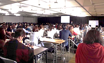 この研究会は、民間と公立の保育士が共に学んでおり、今回は191名の保育士が参加しました。第2弾「いろいろなことに『気づく目』『感じる心』をもった保育者に!!」をテーマに、保育者にとって必要な「5つのみる」について具体的な場面を含めて話し、「みる」には自然の中での練習が必要ということを事例を挙げながら解説しました。
