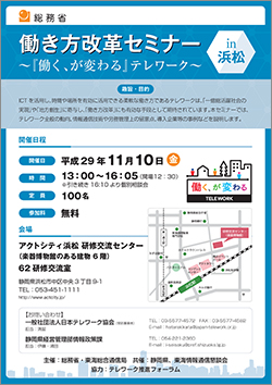 | 備考 | お申込み等の詳細はこちら 総務省働き方改革セミナー 『働く、が変わる』テレワーク in 浜松 (別ウィンドウで開きます) |