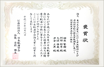この論文は、東日本大震災の津波で被災したタンカーなどの大型船の被災実態調査に基づき、津波来襲時の大型船舶の挙動解析などにより係留限界津波高さの推定を試みた結果を纏めたものです。これまでに、榊原教授のチームでは同様の研究を継続して進めており、これまでの一連の過程が評価されての受賞となりました。被災実態の調査や論文の取りまとめを榊原教授が行い、阿部教授は津波数値解析の立場から論文作成に携わりました。