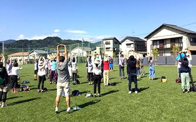 保育学部の今村貴幸准教授が、ウォーキング出発前に参加者の方々に対して運動を実践することの重要性を中心とした健康講座と怪我の予防のためのストレッチング及び「歩行寿命」を延伸するための正しいウォーキングのポイントについて実践的な指導を行いました。