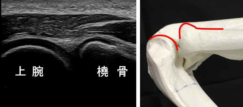 成長期のスポーツ選手が肘関節外側部痛を訴える場合、肘関節の離断性骨軟骨炎を念頭に置く必要があります。なかには本症を発症していても疼痛を訴えない場合もあり、医療者はスポーツの程度(野球であればポジションや投球数、レベル)なども考慮し、臨床症状を確認する必要があります。本疾患を看過し、悪化させることで永続的な肘関節機能障害を生じさせる可能性があります。よって、医療者やアスレチックトレーナー、スポーツ指導者は、本疾患に対して深い知識と理解が必要です。写真は肘関節の超音波観察装置を用いた画像です。