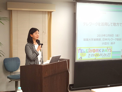 2月8日(金曜日)、本学経営学部小豆川裕子准教授が、本シンポジウムで、「テレワークを活用して地方で働く魅力」のテーマで基調講演を行い、あわせて岩見沢市、軽井沢町、永平寺町の推進担当の者の方々とのパネルディスカッションのコーディネータを務めました。