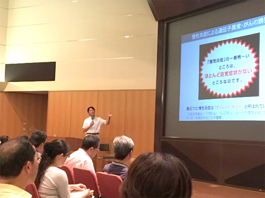 ヒトの細胞はどうなっているのか、どういう仕組みでがん細胞が作られるのか、最新の研究成果や治療法、そして、その値段など、市民の方にわかりやすく講義しました。会場は、熱心にメモをとる姿が見られる一方、ユーモラスな話題には何度も笑いが起こり、和やかな雰囲気でした。