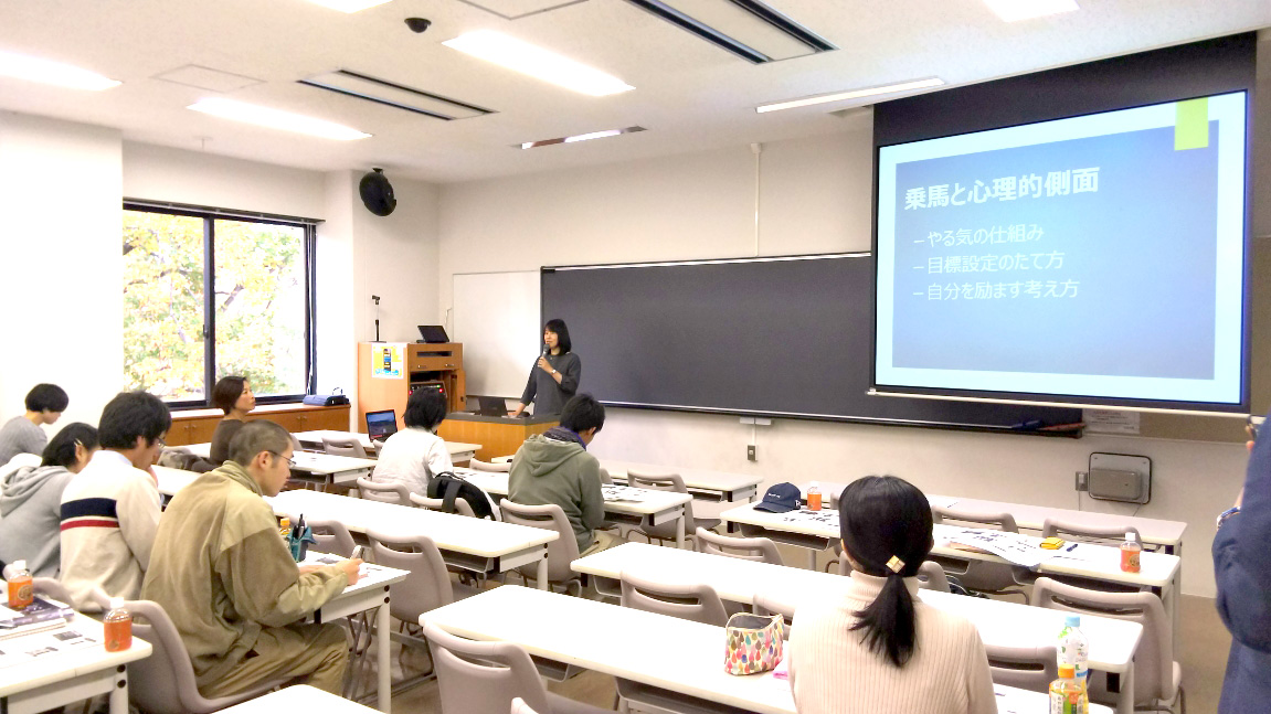 この日本障がい者乗馬協会が主催したホースセラピー講習会が、12月7日(土曜日)法政大学にて行われ、本学教育学部の百瀬容美子准教授が乗馬で得られる心理的効果やパラリンピックを目指すためのメンタルスキルトレーニングに関する講義を行いました。