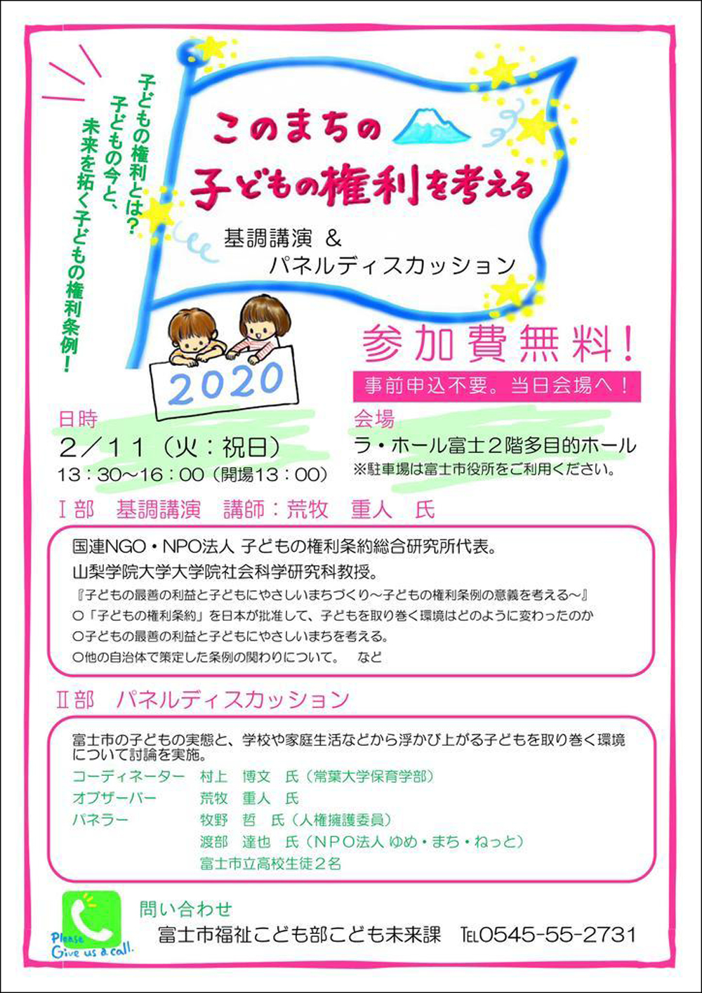 2月11日(火曜日)、富士市のラ・ホール富士多目的ホールにて「このまちのこどもの権利を考える」(富士市主催)と題して基調講演&パネルディスカッションが開催され、後半のパネルディスカッションでは富士市の子ども・子育て会議の会長である本学保育学部 村上博文准教授がコーディネーターを務めました。会場には、市長、教育長、保育・教育関係者、保護者、子育て支援団体の関係者など、子どもの権利に関心を寄せる市民の方々が100名以上も集まり、関心の高さが伺えました。現在、富士市では2021年度に「(仮称」子どもの権利条例」策定及び施行に向けて、小学生、中学生、高校生、そして保護者を対象に子どもの権利に関するアンケートを実施するなど準備を始めています。