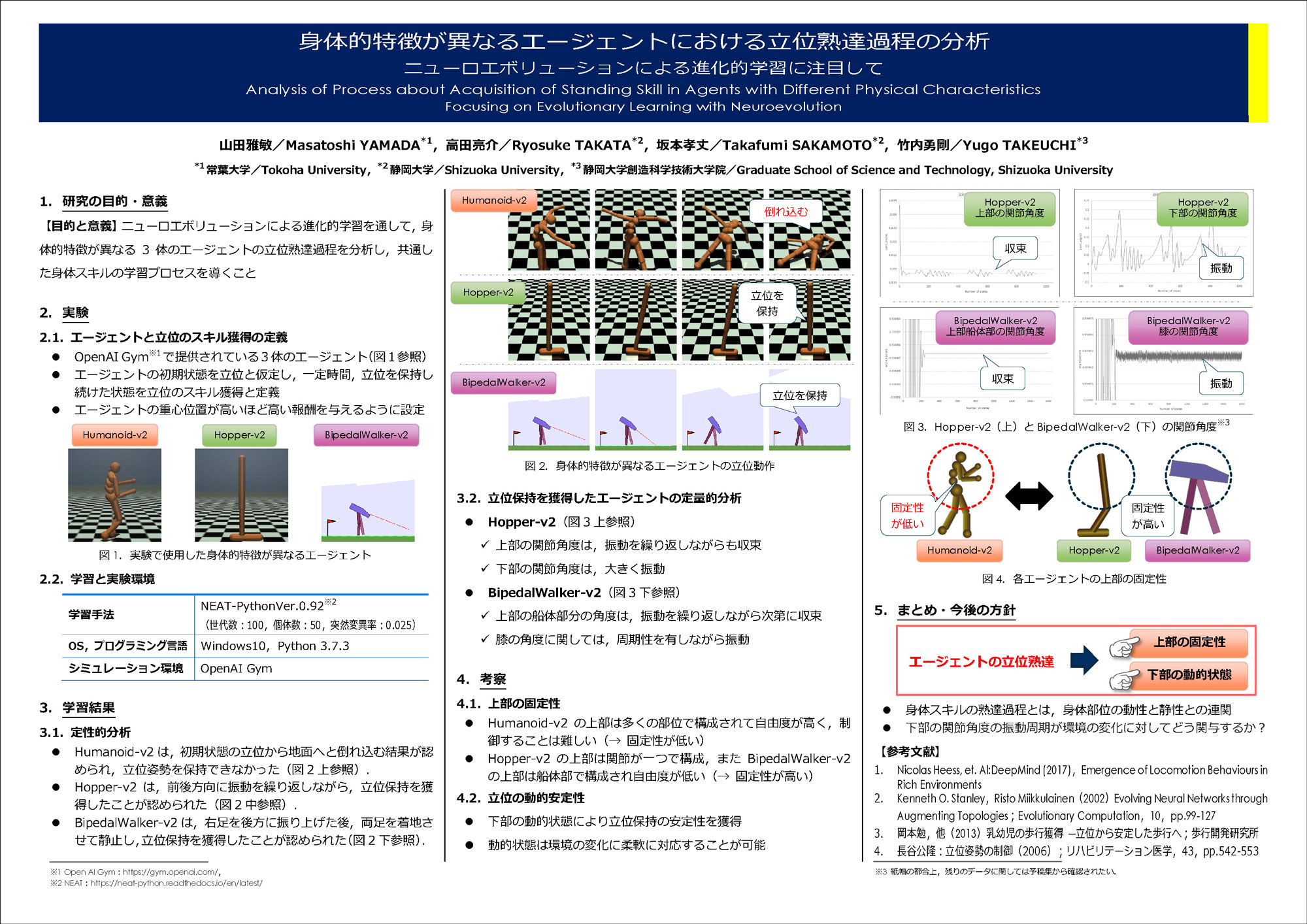本研究は、ニューロエボリューションによる進化的学習を通して、身体的特徴が異なる3体のエージェントの立位熟達過程を分析し、エージェントの身体スキルの学習プロセスを導くことを目的としました。