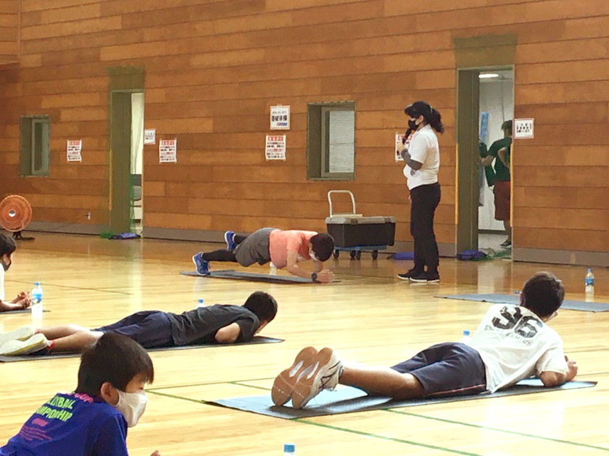 また、誤ったトレーニングをすることがケガにつながる、成長期は体が変わってくるので、同時に動きを変えなければならないと話し、成長期に合わせた体幹トレーニングを指導しました。三木選手に手本をお願いし、参加者ひとりひとりに声をかけながら、いくつかのメニューに挑戦してもらいました。様々なメニューのなかでも、「新しいことをやるときは、なるべく早く理解することが大切」と頭も使って、考えて行うことが必要だとも話しました。