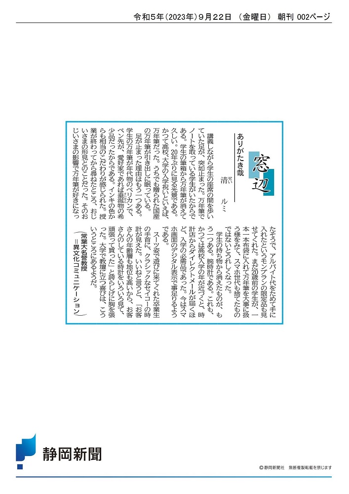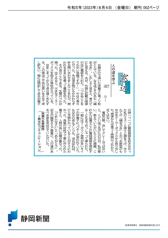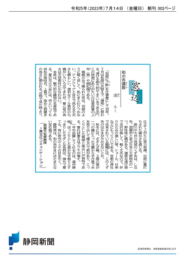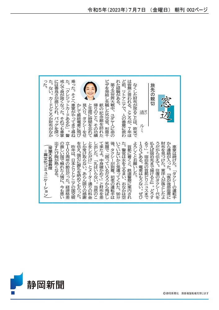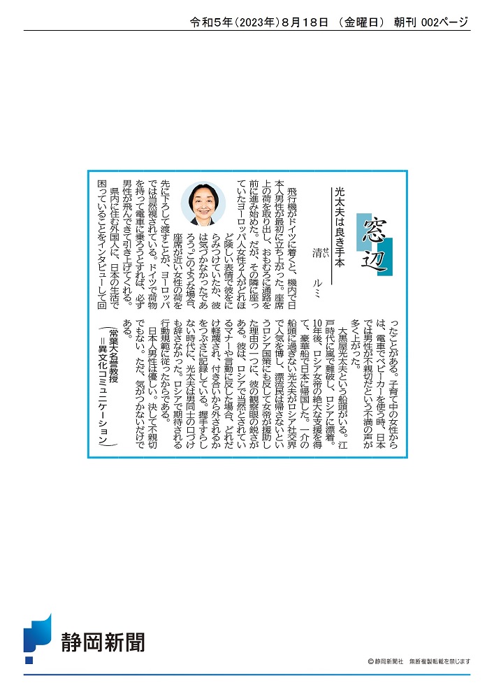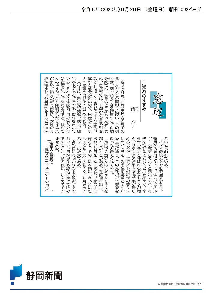静岡新聞コラム『窓辺』に連載されました(全13回)/清 ルミ(Rumi Sei)名誉教授