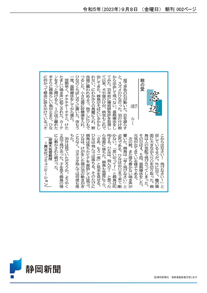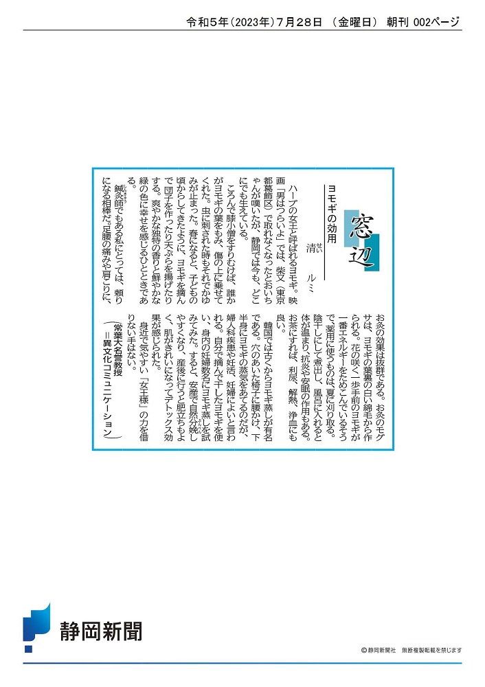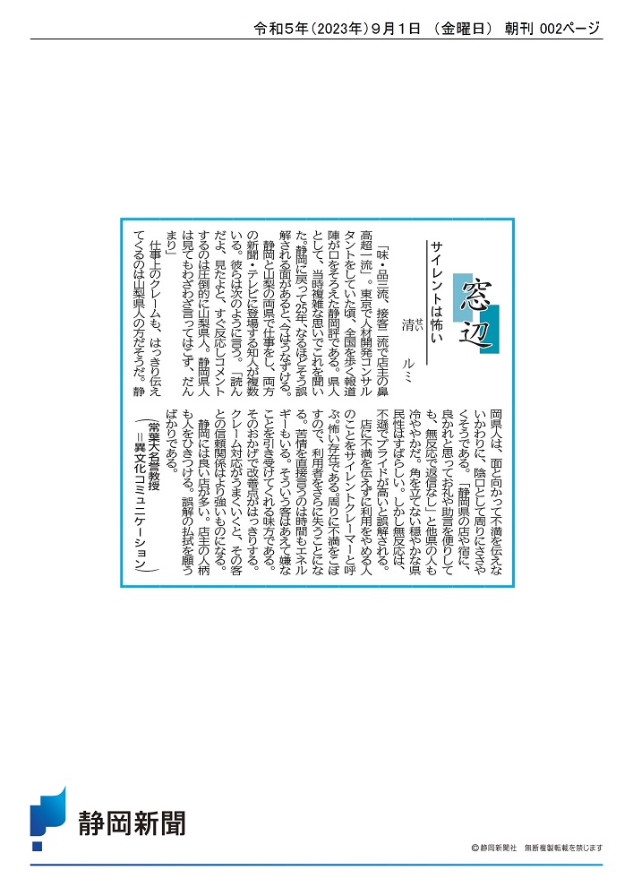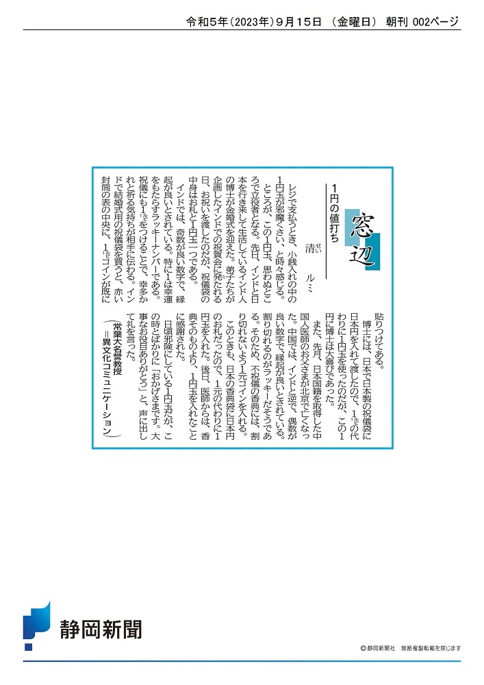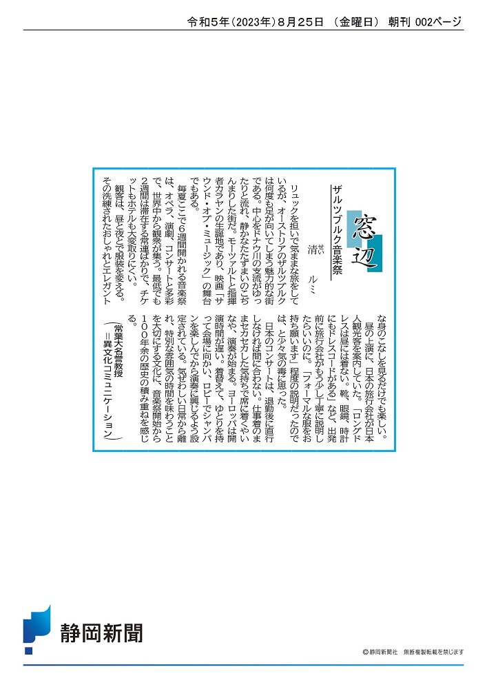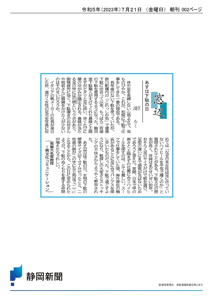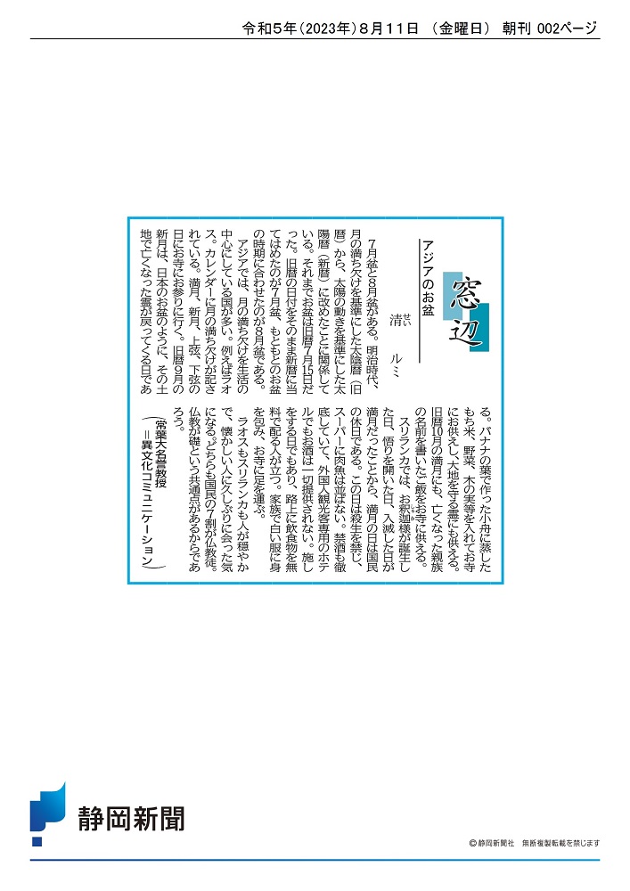 静岡新聞コラム『窓辺』に連載されました(全13回)/清 ルミ(Rumi Sei)名誉教授