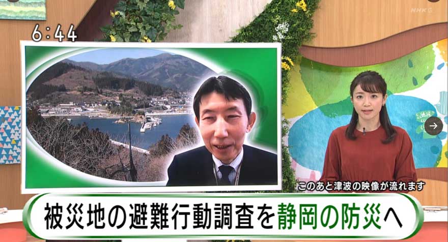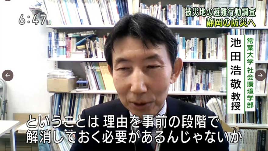 社会環境学部の池田浩敬教授の津波避難に関する研究成果が、2月12日(金曜日)18時10分より放送のNHK総合「たっぷり静岡」で取り上げられました。東日本大震災の被災地、岩手県大船渡市の三陸町綾里などでの聞き取り調査をもとに、多くの避難者が直ちに高台へと逃げていないことを明らかにしました。さらに、行動の理由・原因も含めた避難行動データベースを作成し、次の津波災害に備えて、すぐに高台へ避難しない理由・原因を地域の皆で解消していくような取り組みが重要だと話しました。