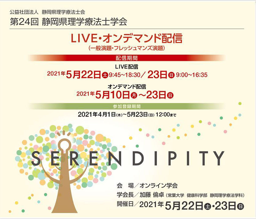 5月22日(土曜日)・23日(日曜日)に第24回静岡県理学療法士学会がオンラインで開催されました。2日間で14の講演と150の一般演題を配信し、参加者は県内外合わせて600名以上でありました。本学健康科学部静岡理学療法学科 加藤倫卓准教授は学会長、塚本敏也講師は準備委員長、栗田泰成准教授は公開講座局長、中野聡子講師は公開講座副局長として学会の中心役員として活躍しました。本学の教員からは一般演題を4題、セミナーの司会や講師も多数行われ、また、本学の在学生や卒業生も多数参加しました。 関連リンク 教員を知ろう! 加藤倫卓准教授についての情報はこちら 教員を知ろう! 塚本敏也講師についての情報はこちら 教員を知ろう! 栗田泰成准教授についての情報はこちら 教員を知ろう! 中野聡子講師についての情報はこちら