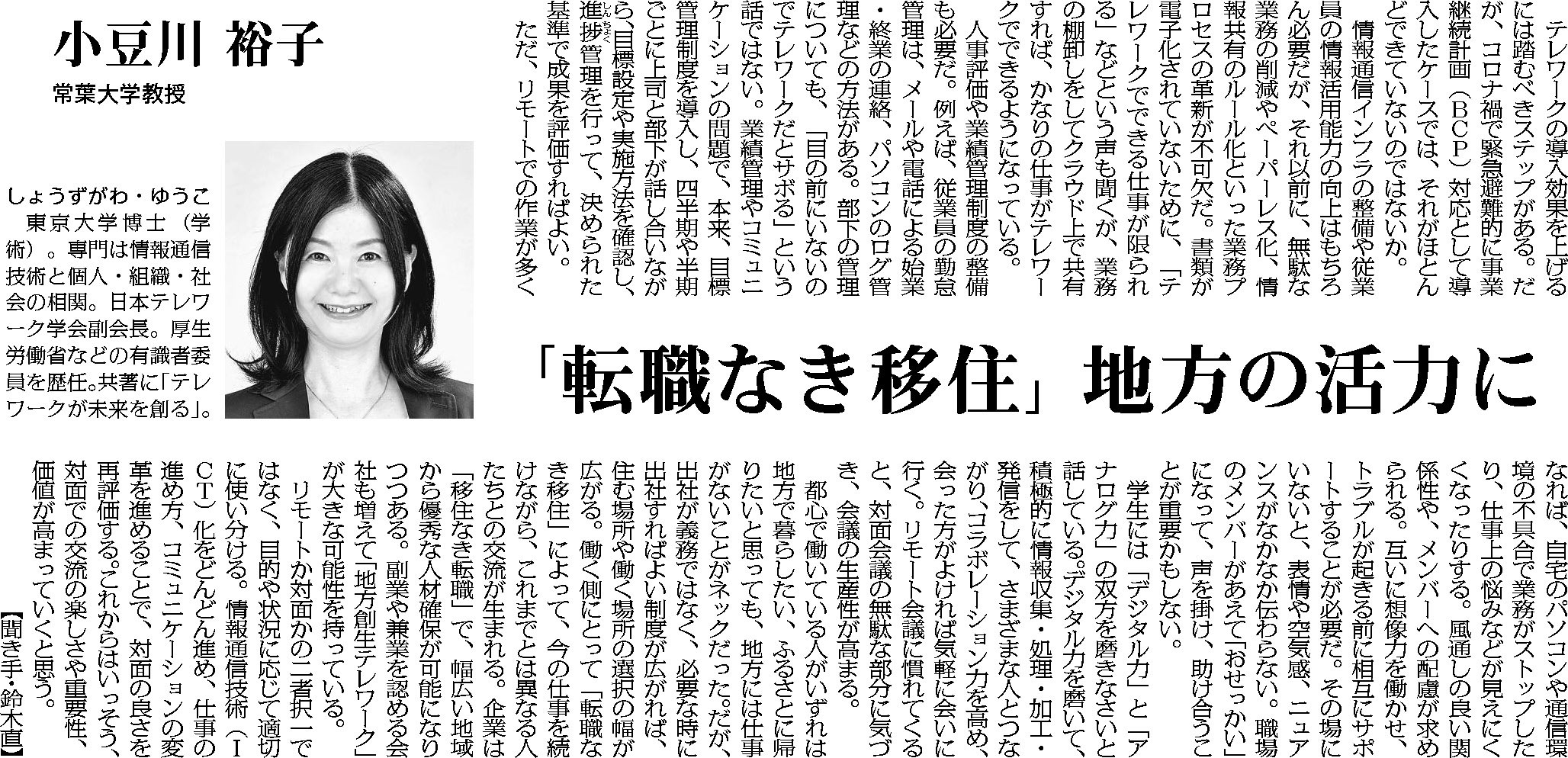 8月18日(水曜日)毎日新聞朝刊、オピニオン『論点』の特集「リモート1年 何見えた」において本学経営学部 小豆川裕子教授のインタビュー記事が掲載されました。