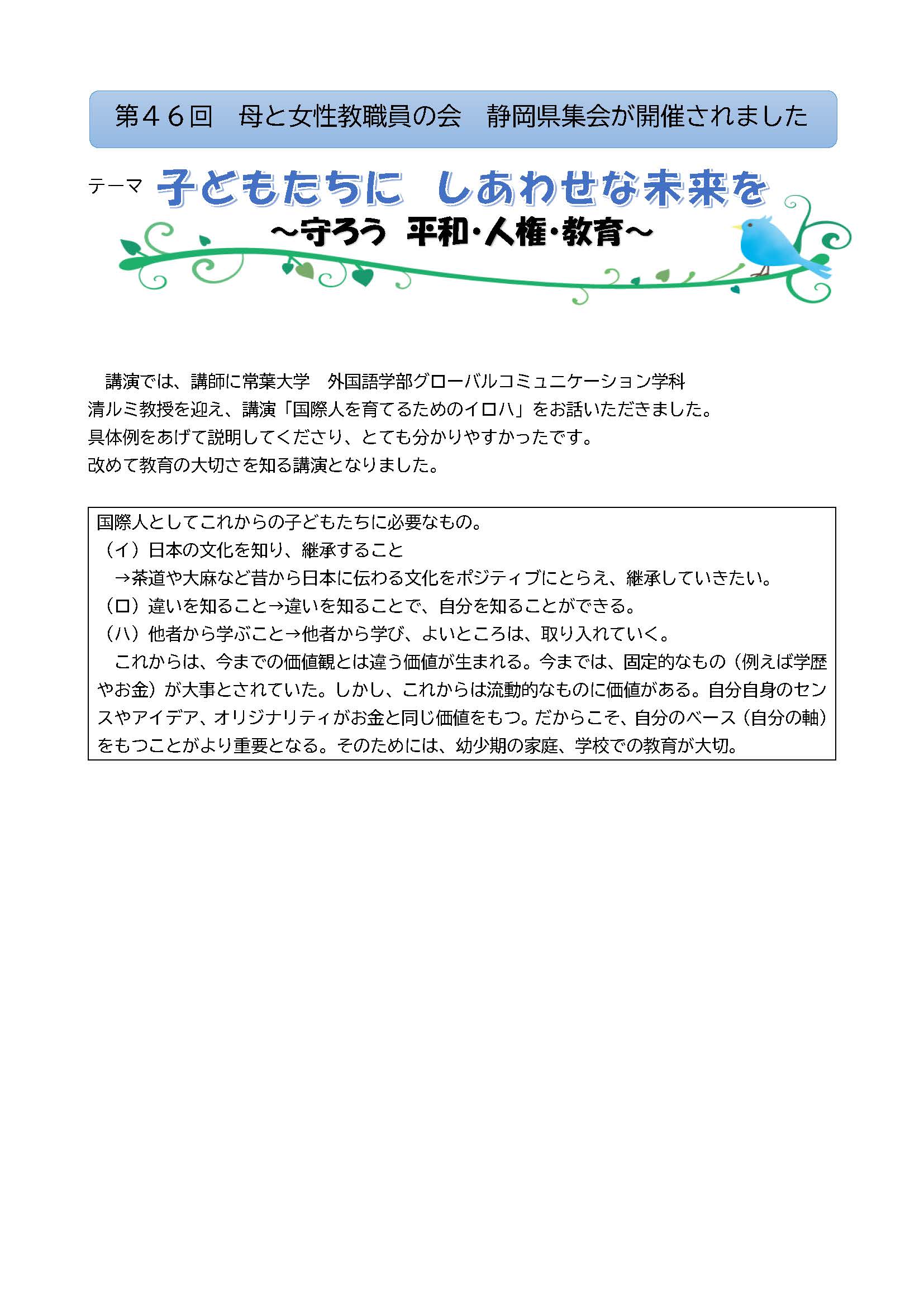 本学外国語学部 グローバルコミュニケーション学科の清ルミ教授が、10月9日(土曜日)、静岡県教職員組合主催「第46回 母と女性教職員の会 静岡県集会」で講演を行いました。 関連リンク 教員を知ろう! 清ルミ教授についての情報はこちら