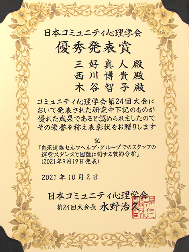 本発表は,自死というかたちで家族を亡くした人を支えるコミュニティをつくる人々の実践に焦点を当て,その活動の意義を分析したものです。講師の専門である臨床心理学における当事者コミュニティでの支援の重要性を主張した内容が評価されました。