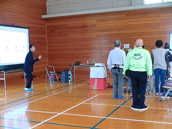当日は『地域で健康に生活するには??』をテーマに、各種調査をもとに普段の生活で心がけてほしいことなど、時折ユーモアを交えながら説明しました。また、後半には人体の関節運動の法則や自宅でできる介護予防のエクササイズを実演し、紹介しました。