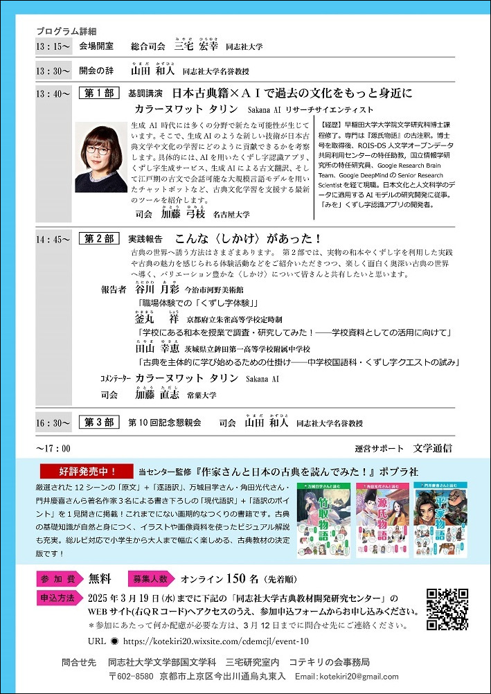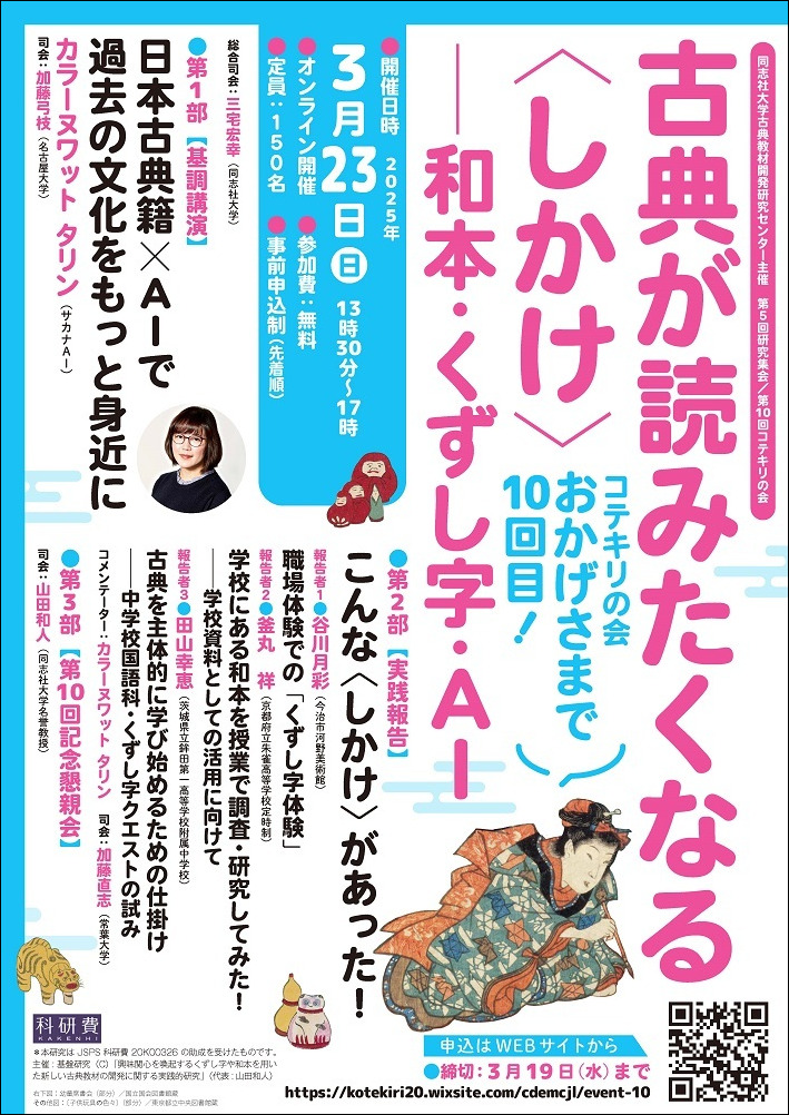 3月23日(日曜日)に開催される『同志社大学古典教材開発研究センター第5回研究集会・第10回コテキリの会(古典教材の未来を切り拓く!研究会)』第2部・実践報告『こんな〈しかけ〉があった!』の司会を、本学教育学部学校教育課程の加藤直志准教授が担当いたします。