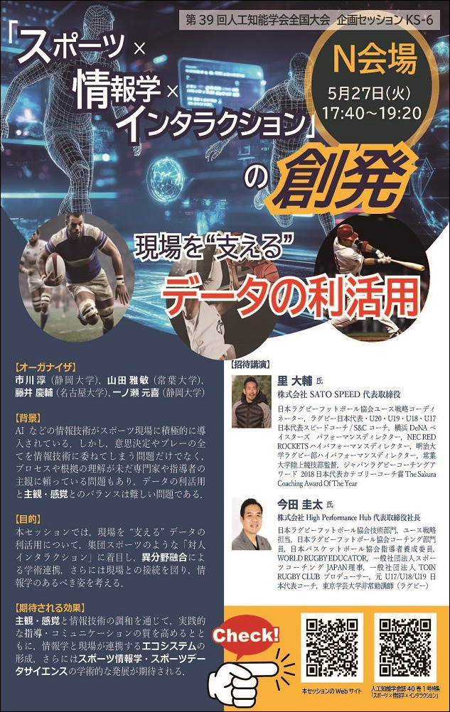 第39回人工知能学会全国大会の企画セッション『「スポーツ×情報学×インタラクション」の創発:現場を“支える”データの利活用』が5月27日(火曜日)に、大阪国際会議場(グランキューブ大阪)で開催されました。